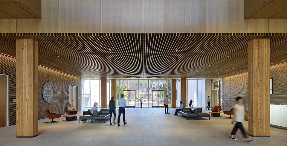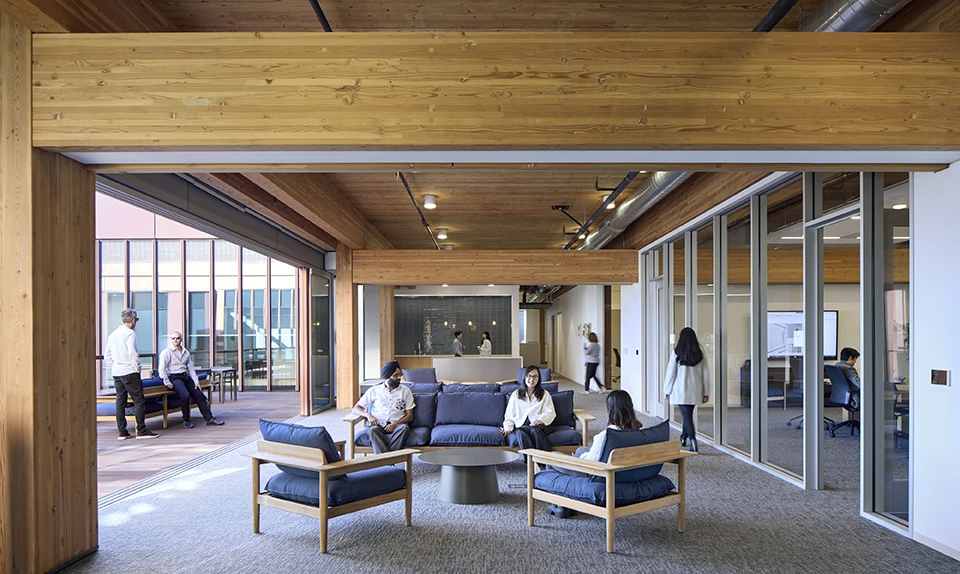 Scheduled to receive LEED Platinum certification, the design was driven by ambitious sustainability goals addressing both embodied and operational carbon— leveraging an innovative timber structural system that reduces materials and systems on site. This mass timber structural design delivered an overall reduction in embodied carbon by 85% relative to conventional steel construction.