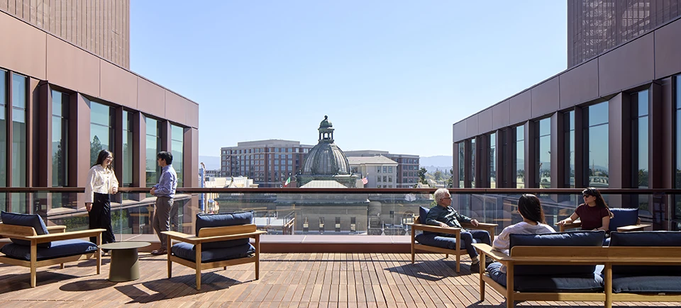 The building’s H-shaped volume links two distinct and previously disconnected neighborhoods of Redwood City: the civic campus to the east, and the downtown commercial core to the west. These create two new plazas that are linked by the glass- enclosed lobby that also acts as an event space, and a pre-function area that can serve as a pre- function and event space for the Board Chambers. All occupants benefit from a design approach centered on biophilia, primarily the result of the use of Cross Laminated Timber exposed ceilings, glulam beams and columns, creating a sense of connection to nature.