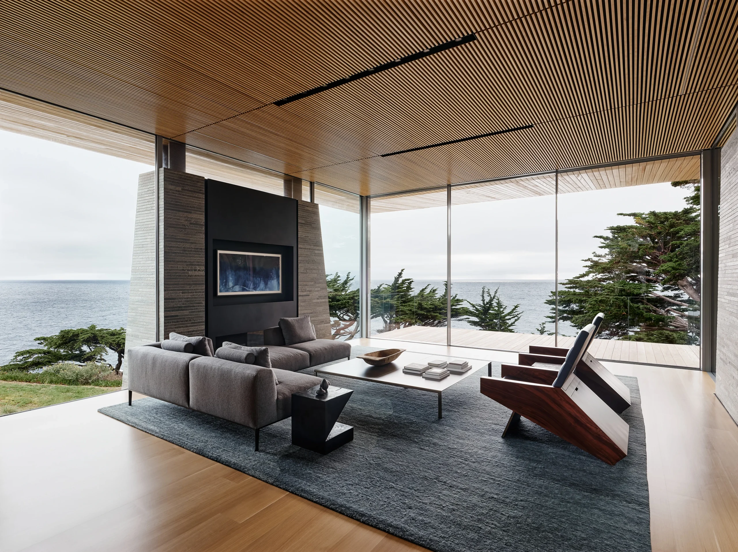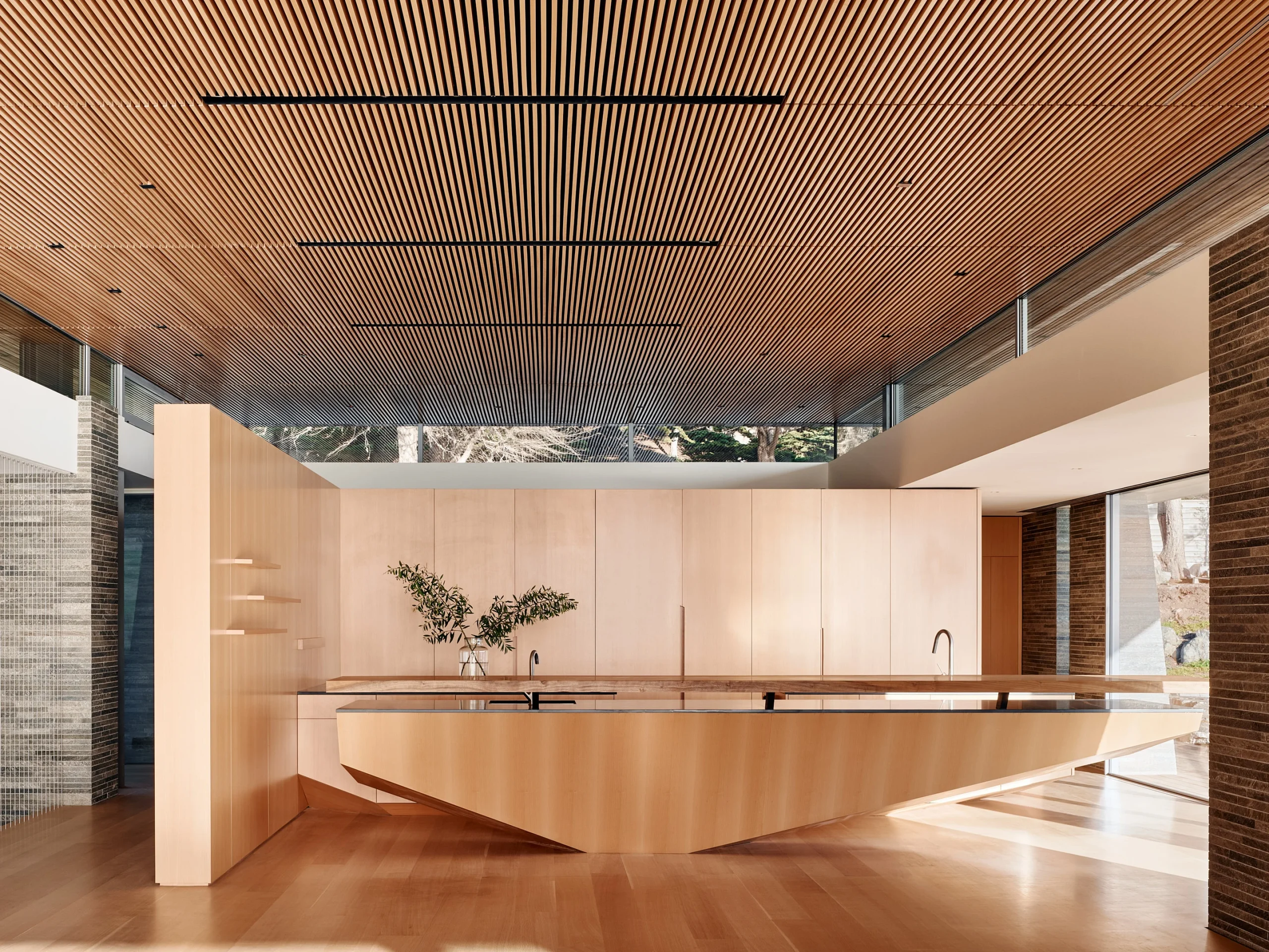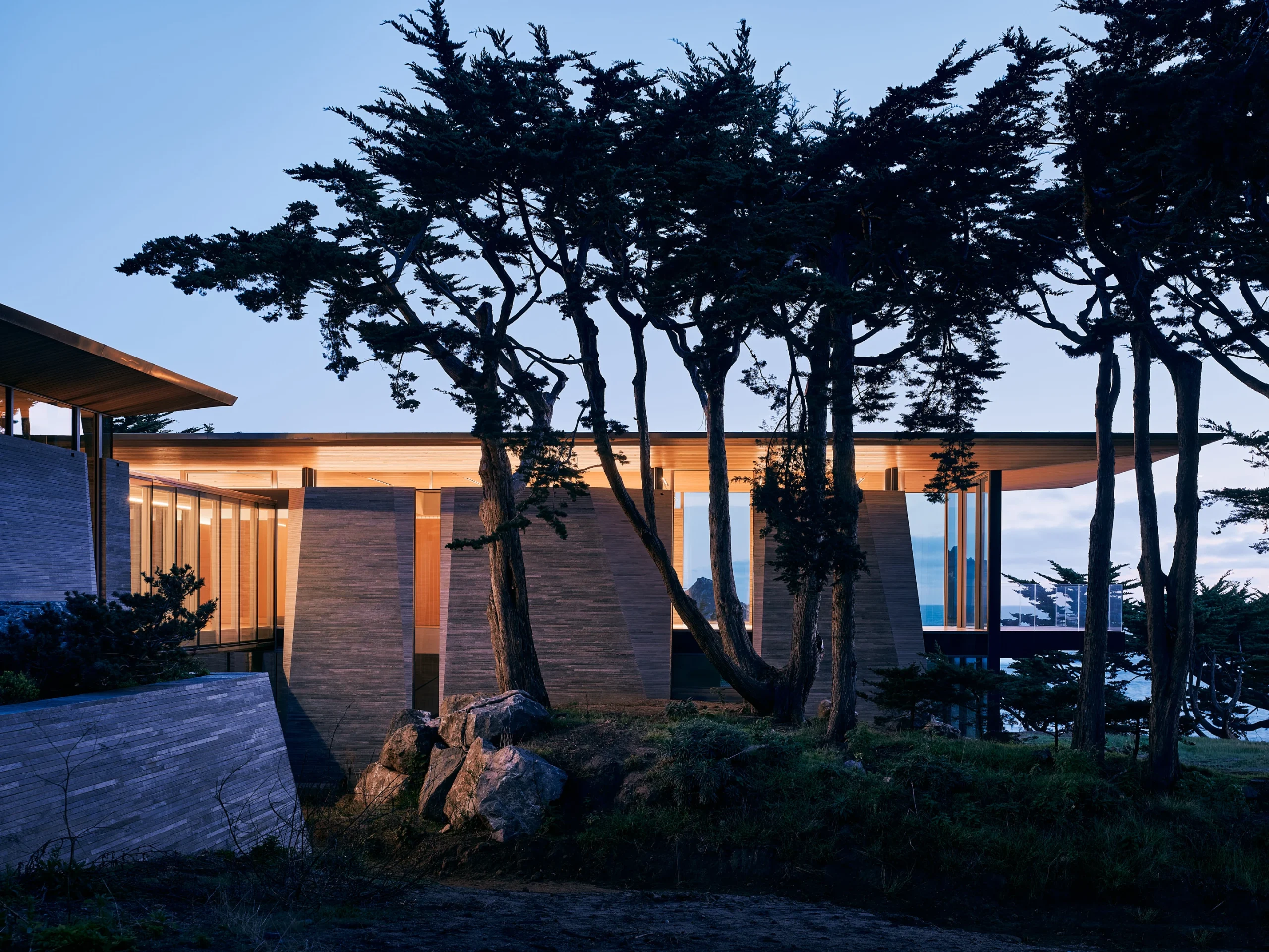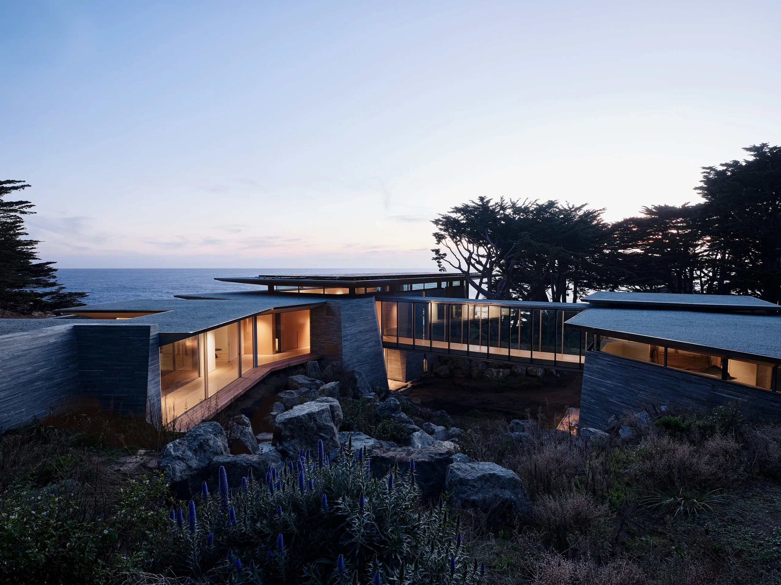 A truly exceptional project with an exemplary approach to site, massing, materiality, tectonic expression, and spatial choreography. The geometric organization in plan and section is well-crafted and the bifurcated pavilions beautifully allow for the passage of the coastal stream from the hillside to the ocean. The ambition to thoroughly bridge climate, ecology, and design result in a beautiful, architecturally significant home. The site is addressed beautifully.