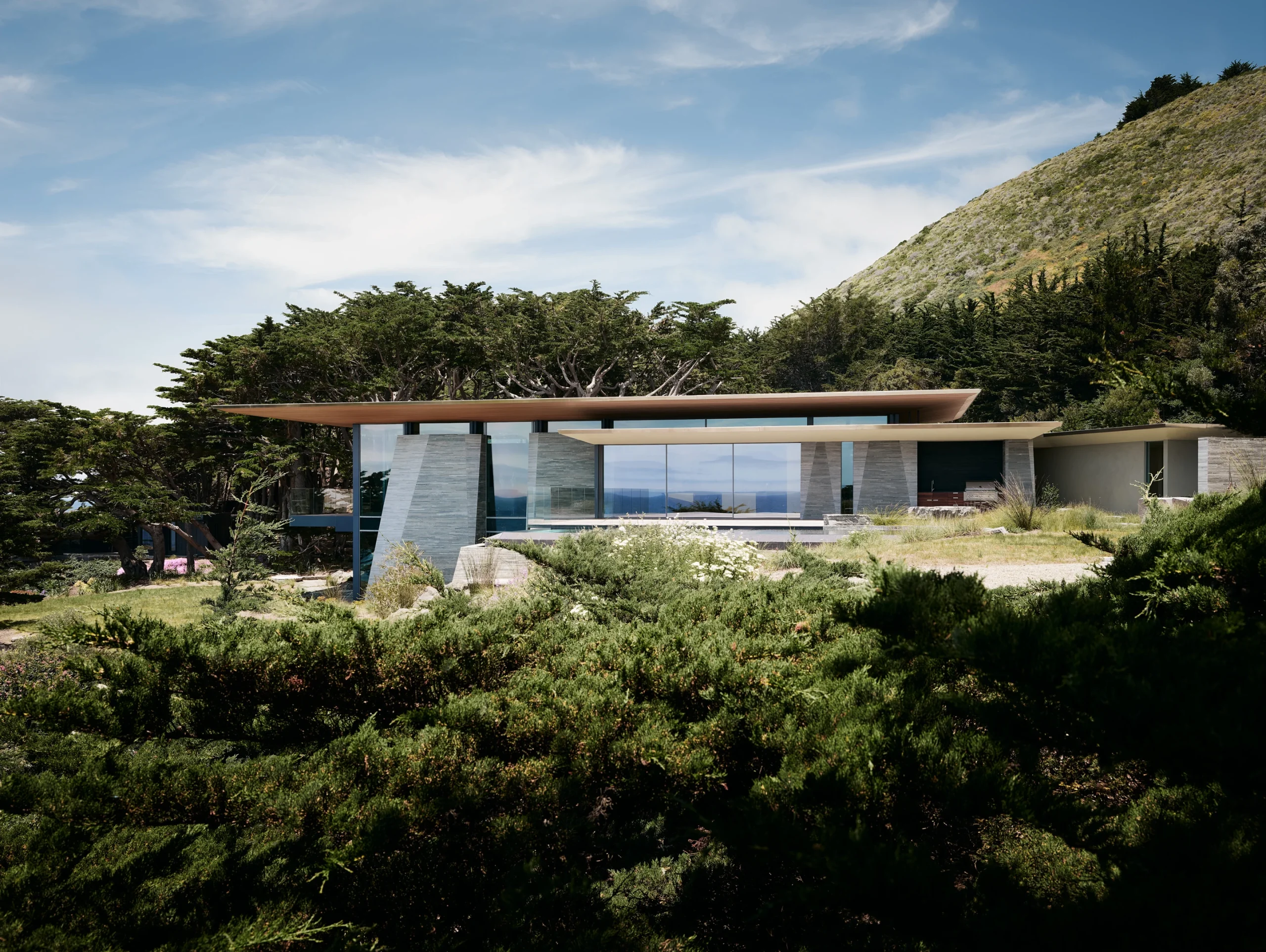 Situated on the California coast between the Santa Lucia mountains and the Big Sur cliffs, the home’s complex site presented an opportunity for a deep exploration of site geology and hydrology. Surveys revealed that the apparently flat site was in fact an infilled ravine housing a seasonal waterway. This discovery provided us with a new understanding of the topography and ecology of the site. No longer a plateau, the site had revealed itself to be a ravine.