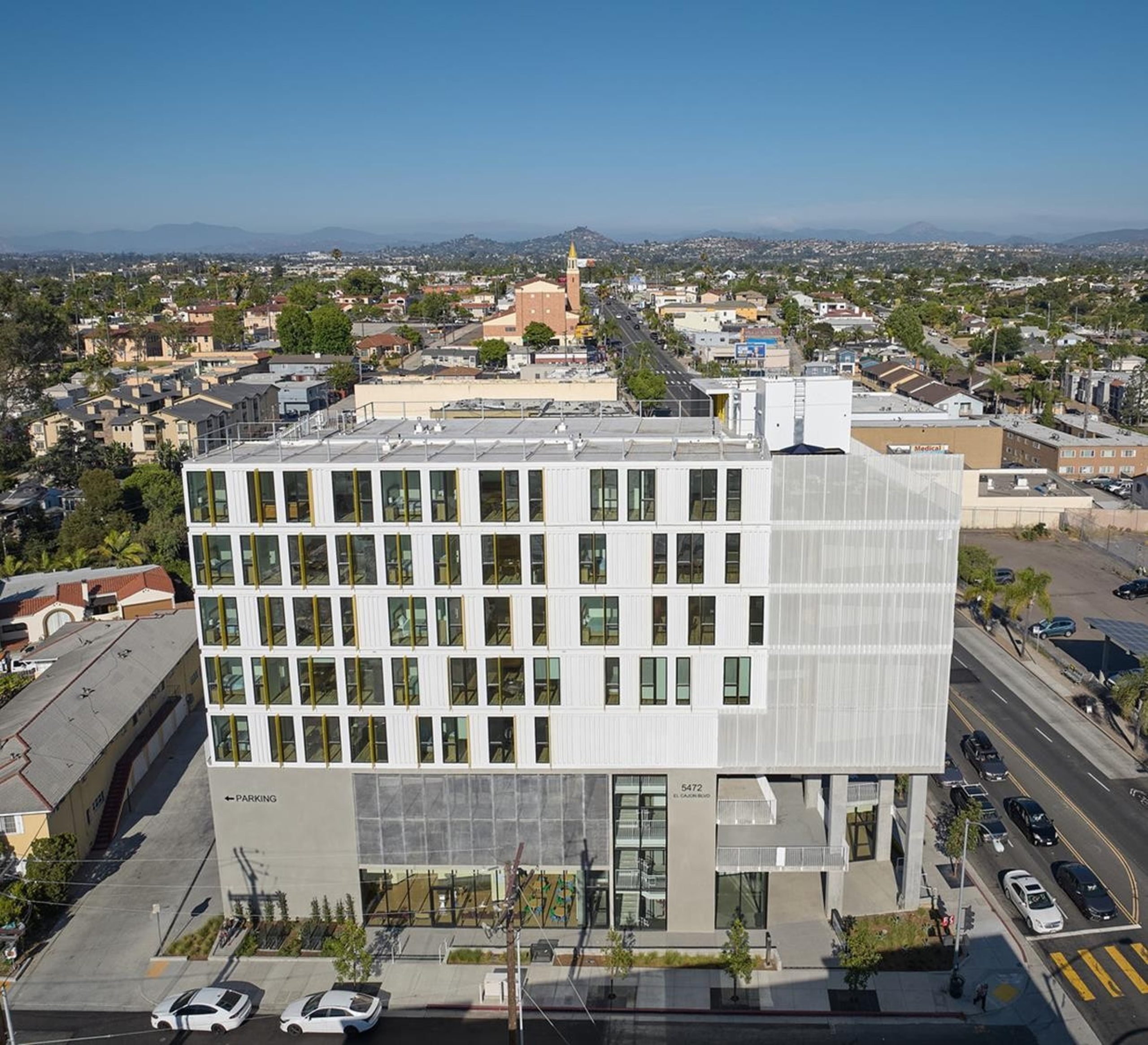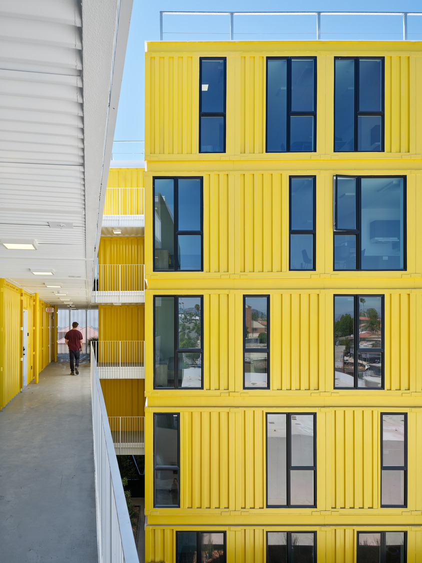 The design embraces its diverse neighborhood context, a mixture of older apartment buildings, retail shops, health clinics and single-family homes. The design massing break apart to scale down along the north towards the apartments and single-family homes while creating a welcoming entrance along El Cajon boulevard with its entry courtyards and upper-level balconies above to connect the users to the community. The facade design is driven from the container module and then scaled down into smaller modules with the window proportions and vertical sunshades to create a multitude of texture and scale.