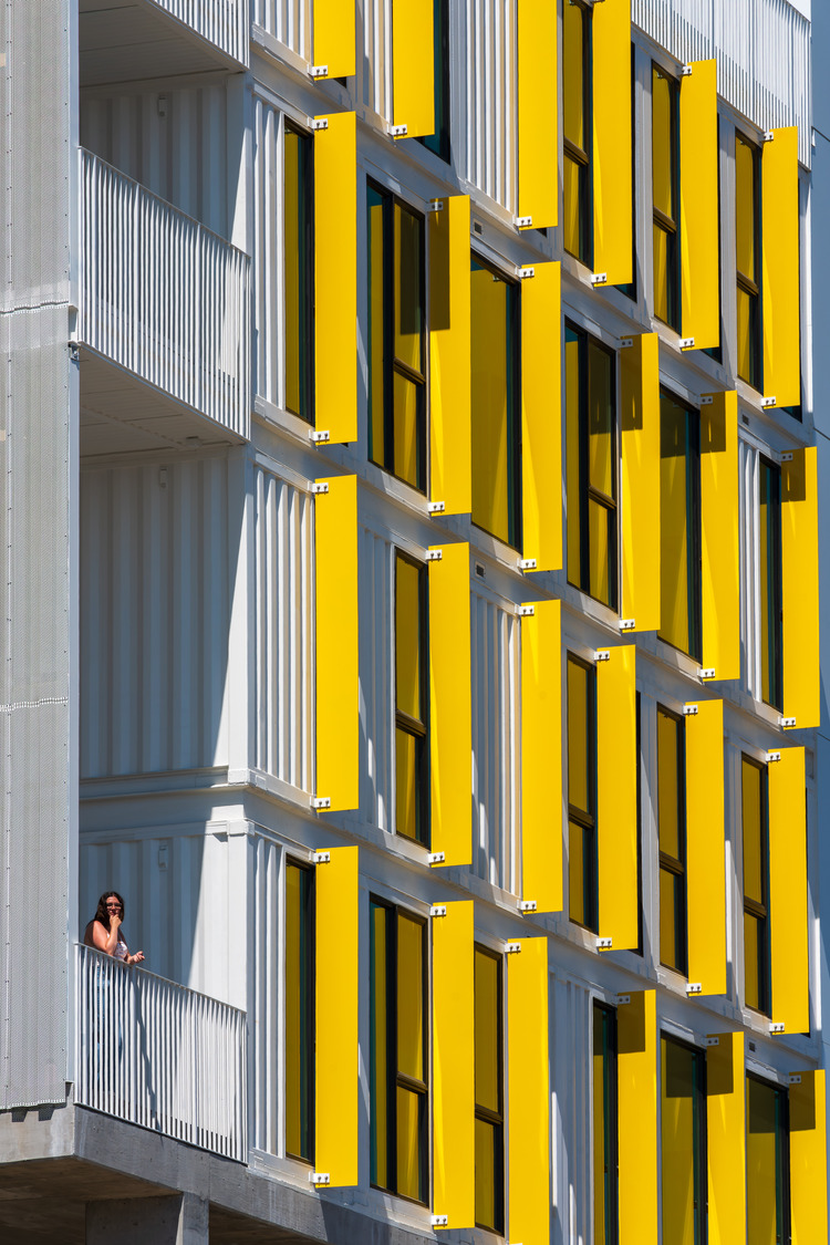 This project takes the humble shipping container that we’ve seen ubiquitously, but applies it in a sophisticated way, in a refined organization that feels dignified. Very well done in terms of massing, fenestration, tectonic expression, and material and colors. It delivers 172 affordable, 100% electric units which is an extraordinary achievement.