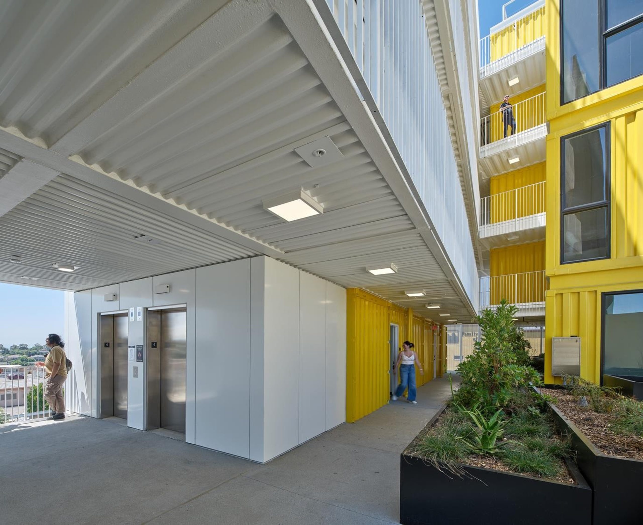 The integrated high performance design builds on the use of recycled single use shipping containers which are highly insulated for thermal and acoustical performance. The passive design features include natural ventilation with operable windows, daylighting and solar heat gain control with exterior vertical sunshades. The MEP system utilizes a high performance centralized VRF system and centralized electric heat pump boiler system for domestic hot water. The roof area is preserved for photovoltaic panels for energy generation and solar thermal panels for hot water generation. The exterior circulation system promotes health and wellness. There are multiple roof vegetated roof decks with a community vegetable garden to reduce heat gain and collect storm water. The site includes a biofiltration system to treat and store water collected on site while promoting biodiversity with its adaptive landscape palette. Overall building performance goals are being achieved to exceed 70% below title 24 and 86.6% below the AIA 2030 challenge benchmark. This project is designed as an all-electric development to promote carbon neutrality in its operations.