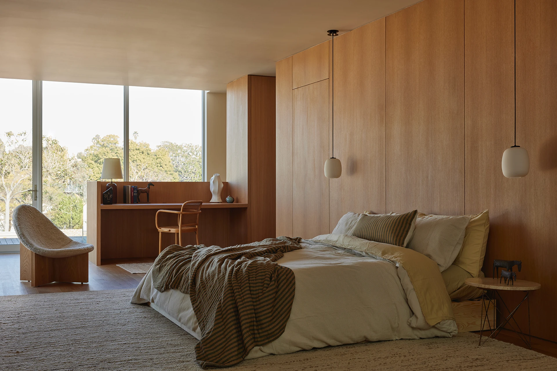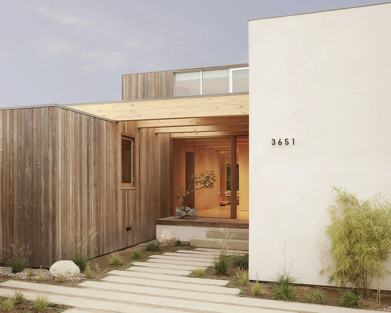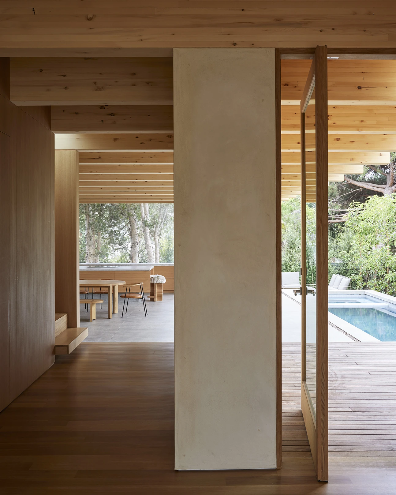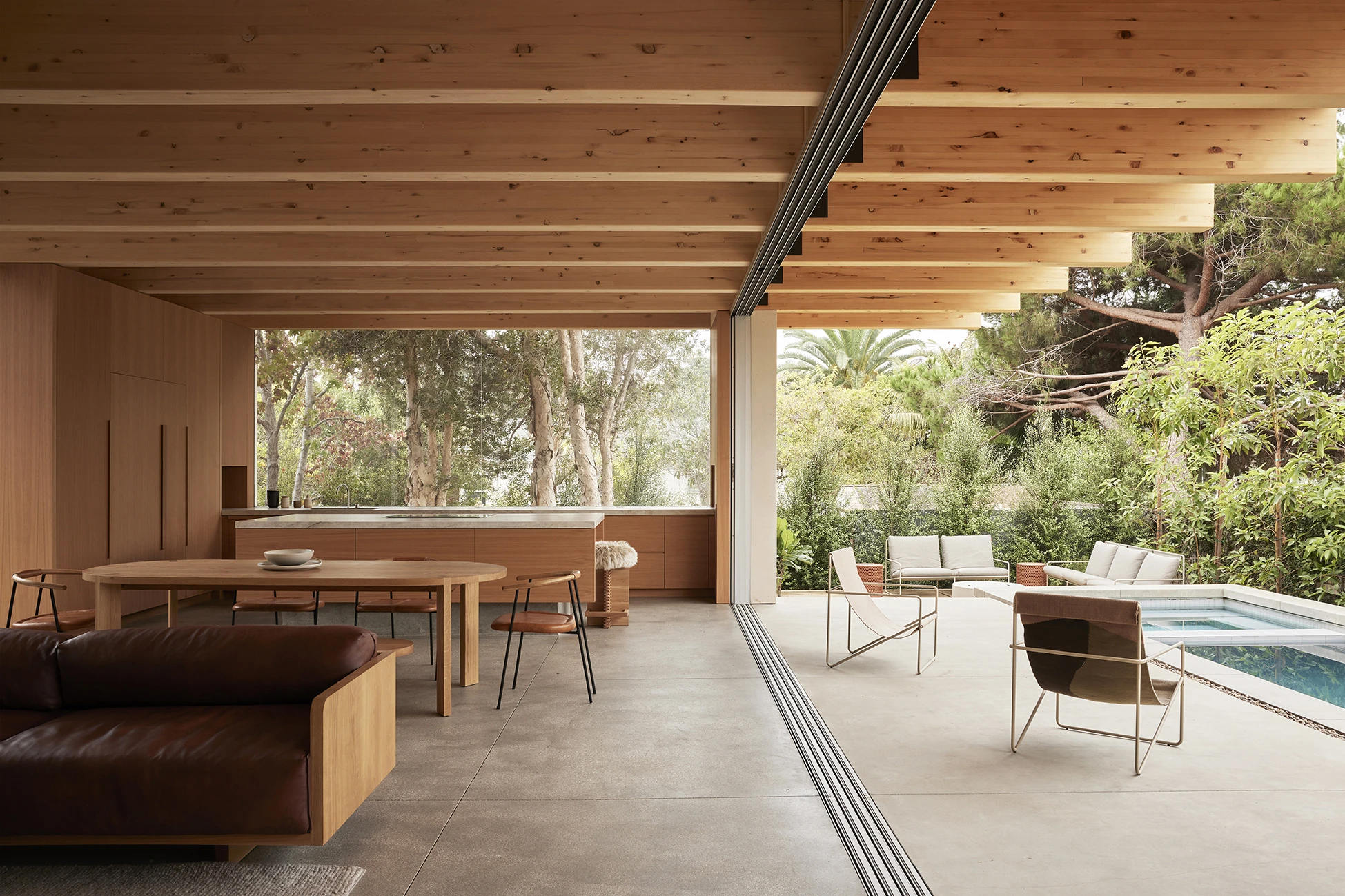 A mandate to avoid drywall is met through the use of wood and concrete finishes and large expanses of sliding glass. The project is organized around a rhythmic layer of heavy beams running from front to back and blurring the line between inside and out. Surrounding the beams are essentially three private volumes; the children’s bedrooms on one side, an ADU on the other, and a primary suite above. Common living space is consolidated and situated at the rear of the property, below the beamed canopy and amongst the landscape. The beams lead one through a small entry court and into a central mixing chamber, where all spaces can be accessed, but where the outdoor patio and pool almost beckon the visitor to proceed to immediately. The compression that occurs at the entry and corridor are rewarded with a sense of openness and lightness upon arriving at the indoor-outdoor living space. Despite their size and heft, the beams never feel oppressive. Because they are hung from above, the removeable barrier between inside and out is reduced to a thin slider track and the beams almost hover above the space like an umbrella. The stair slips between two beams, enabling access to the primary suite above and a chance to feel the beams as one passes through to above.