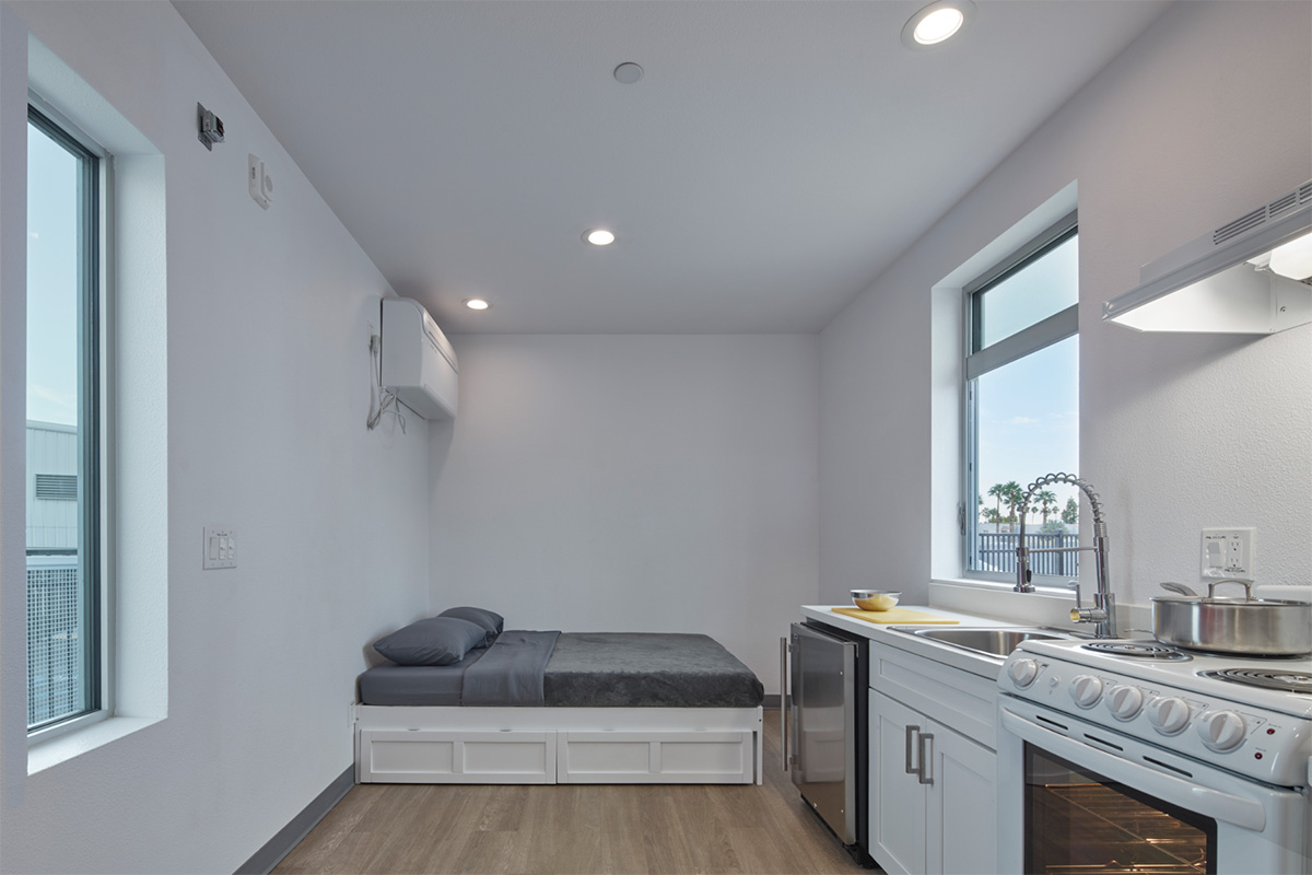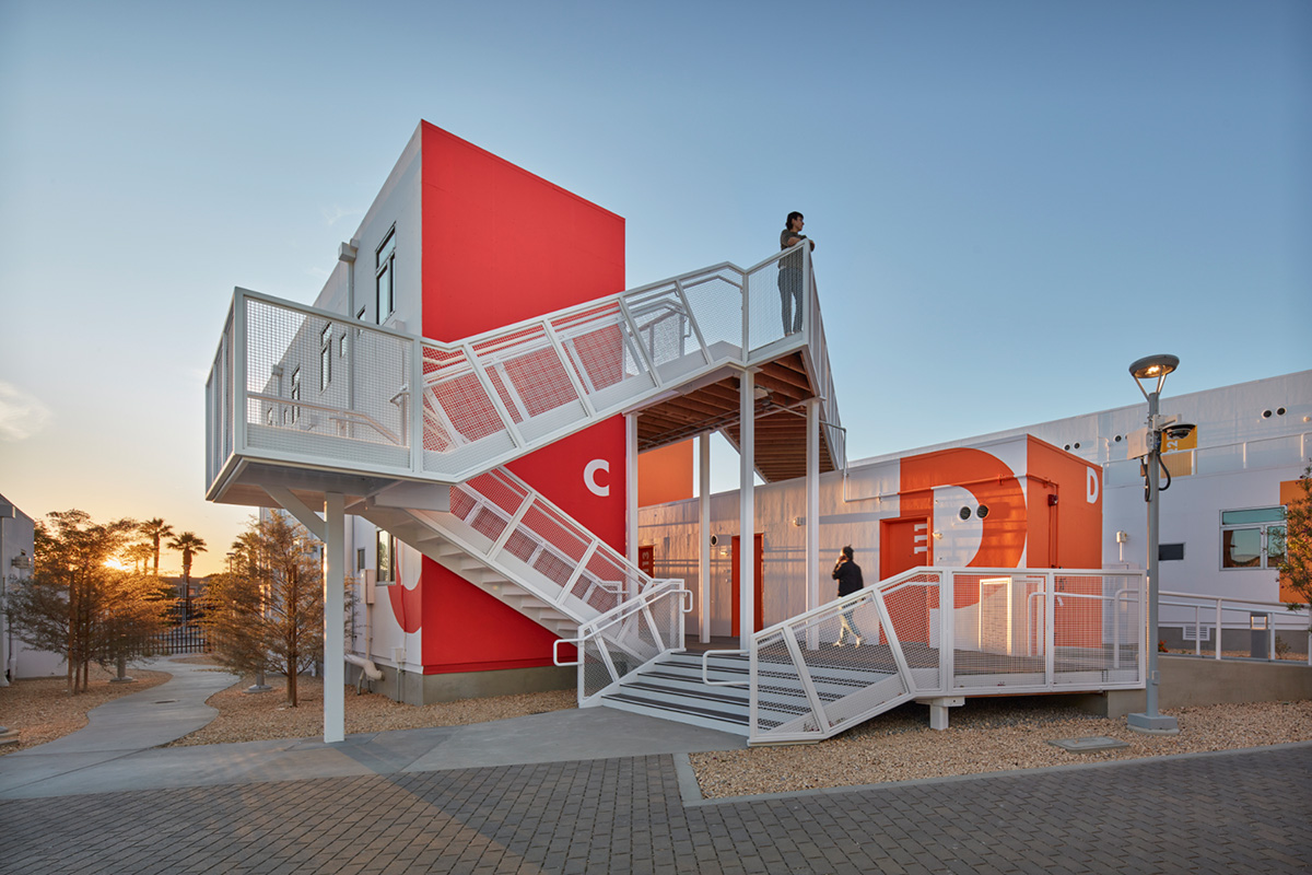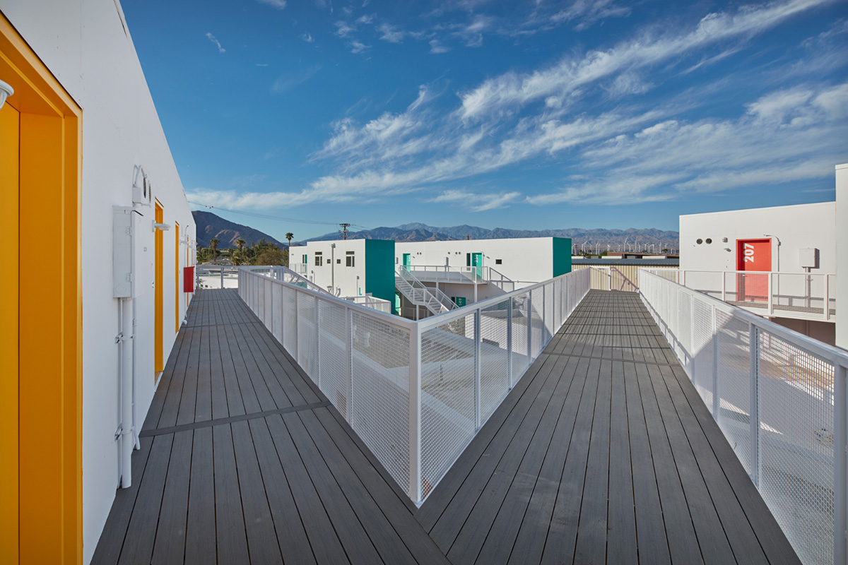 The architects holistically organized the modular housing along a central promenade to create a strong sense of place, organization, and flow, and to promote visibility and security. The 80 new housing units include 51 efficiency studios, 24 dwellings with kitchenettes, and 5 2-BR family residences. Elevated walkways emphasize connectivity and provide shade to below. Each unit has a view of the mountains juxtaposed behind immediate shared outdoor spaces.