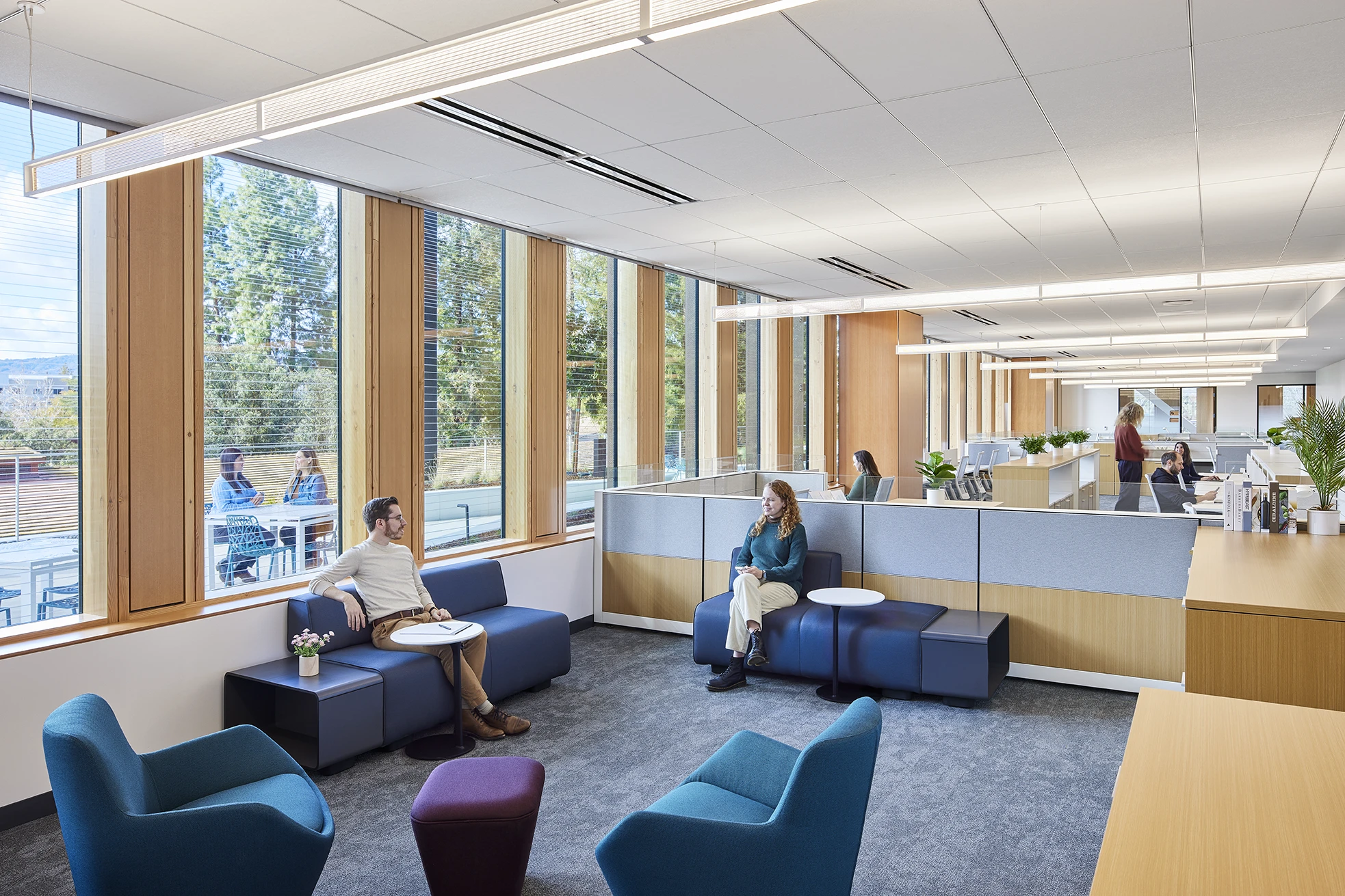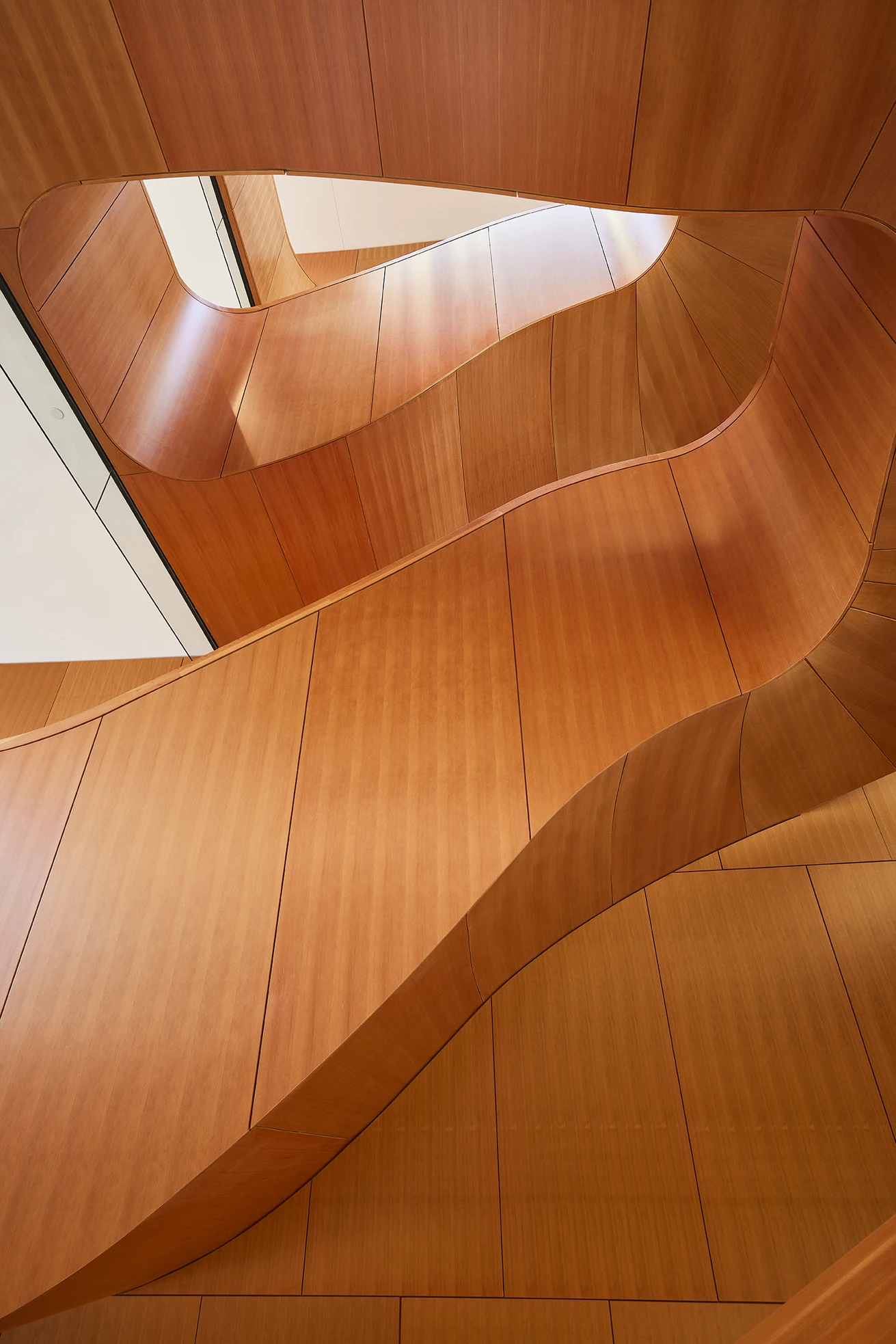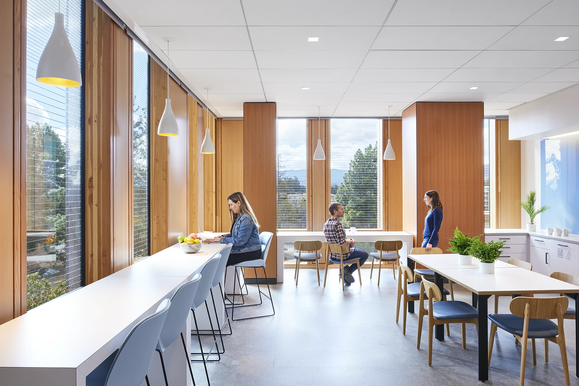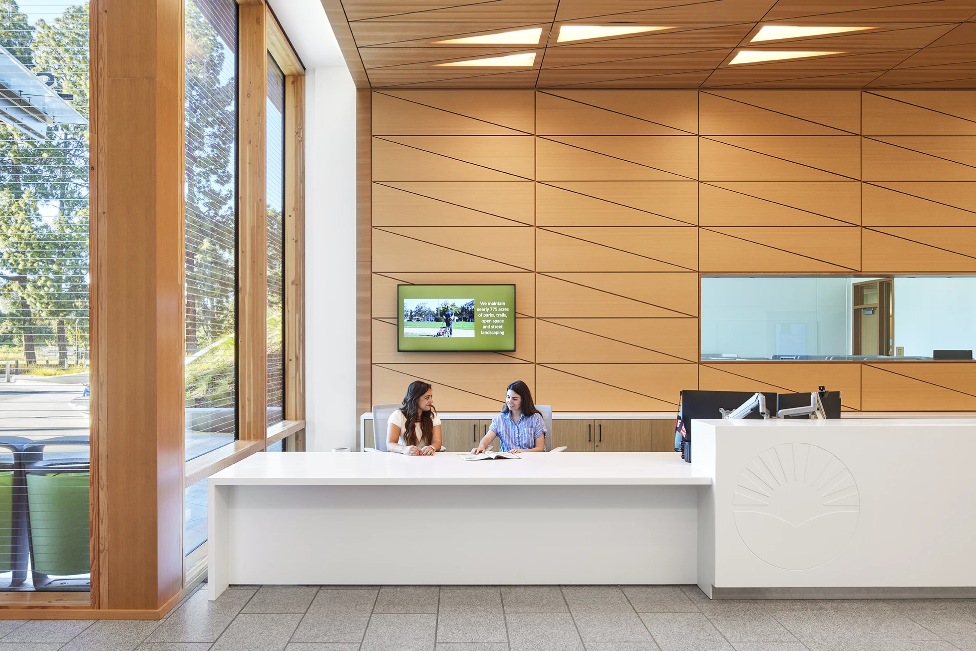 Quietly biophilic, the site and building design honor the heritage trees in the urban forest. Accessible multi-modal pathways resemble tree roots drawing the community into the building. Upon entry, the central stair evokes the spirit of climbing into a tree house, encouraging visitors and staff to move upward through its curves, from earth to sky, encountering the changing views. The heavy timber curtainwall fades into the forested background, and wood ceiling pattern with triangular voids emulates light filtering through interlayered tree branches. At a tactile level, the custom-fabricated conference tables and benches crafted from reclaimed redwood create a touchpoint to the living history of the site.