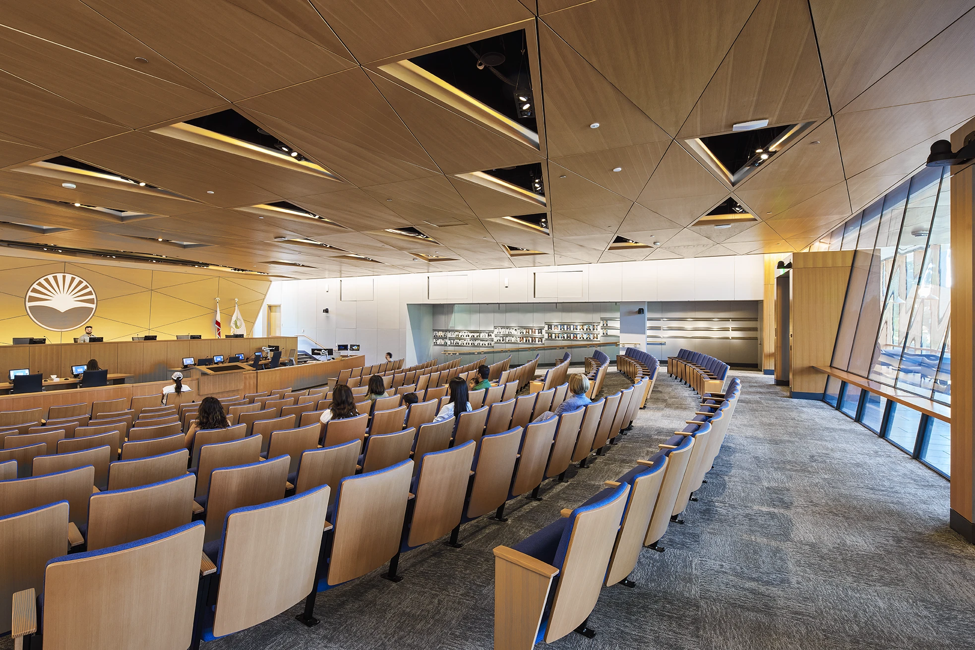 The interior is peaceful and functional, supporting the City’s mission to serve the community responsibly in an accessible and transparent manner. The grade level contains public functions, including the Council Chamber and large flexible meeting rooms available to building occupants and the community at large. The Council Chamber illuminates its purpose during evening Council meetings and welcomes the community into the active and accessible environment from the adjoining exterior Olive Avenue plaza.