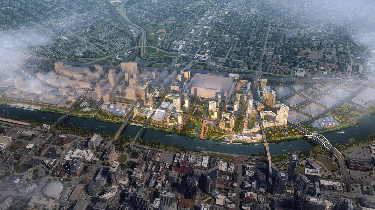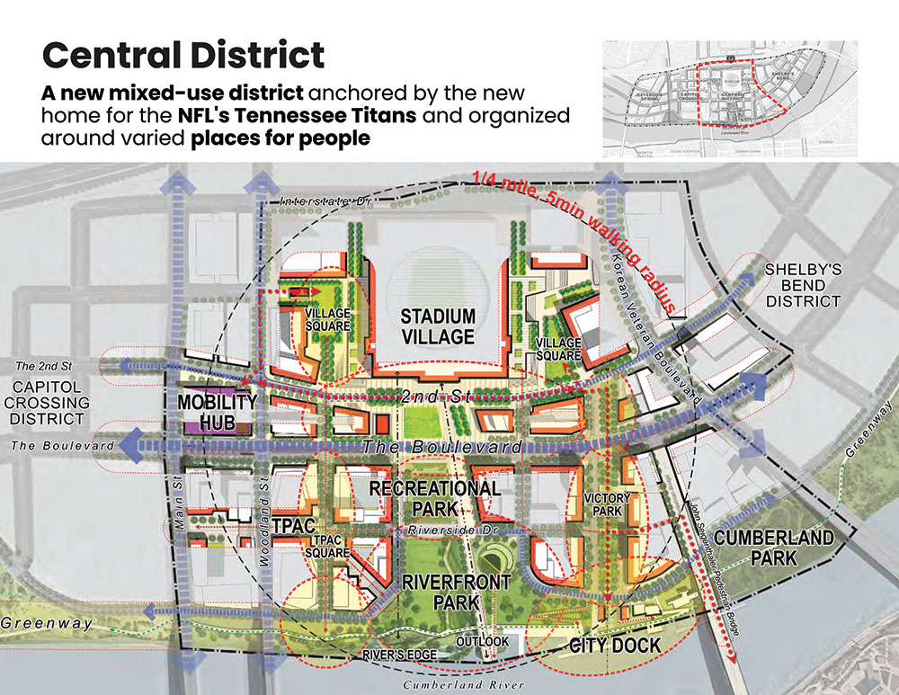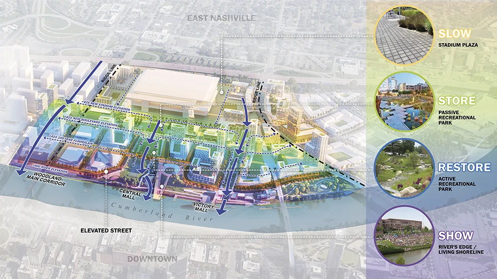 Connecting people to place and engaging the senses, the plan centers on unique public spaces that are unique to the site’s location on the Cumberland River and that could only exist in Nashville. An 11-acre “Central Park” anchors the development, featuring a new Tennessee Titans stadium with panoramic views of the Cumberland River and Nashville skyline. A scenic overlook lets people experience the exhilaration of standing 30 feet above the river and opportunities for people to descend to the river and interact with a living shoreline.